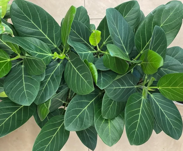පත්ර: පළල්, හම් වැනි ස්වභාවයක් ඇති දිලිසෙන කොළ පැහැති පත්ර වේ.