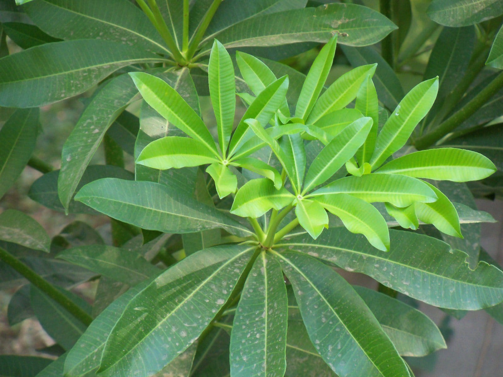 මෙහි පත්ර ඉහළ මතුපිට දිලිසෙන තද කොළ පැහැයෙන් යුක්ත වන අතර පහළ මතුපිට ලා පැහැතිය. ඒවා පත්ර 4 සිට 8 දක්වා වූ වක්ර (whorls) ලෙස පිහිටා ඇත. පත්රයක ඇති කැපී පෙනෙන ලක්ෂණයක් වන්නේ එහි මැද නාරටියට ලම්බකව පිහිටි නාරටි යුගල 25-40ක් පමණ පැවතීමයි. මෙය පත්රයට රිබ්ඩ් (ribbed) පෙනුමක් ලබා දෙයි.